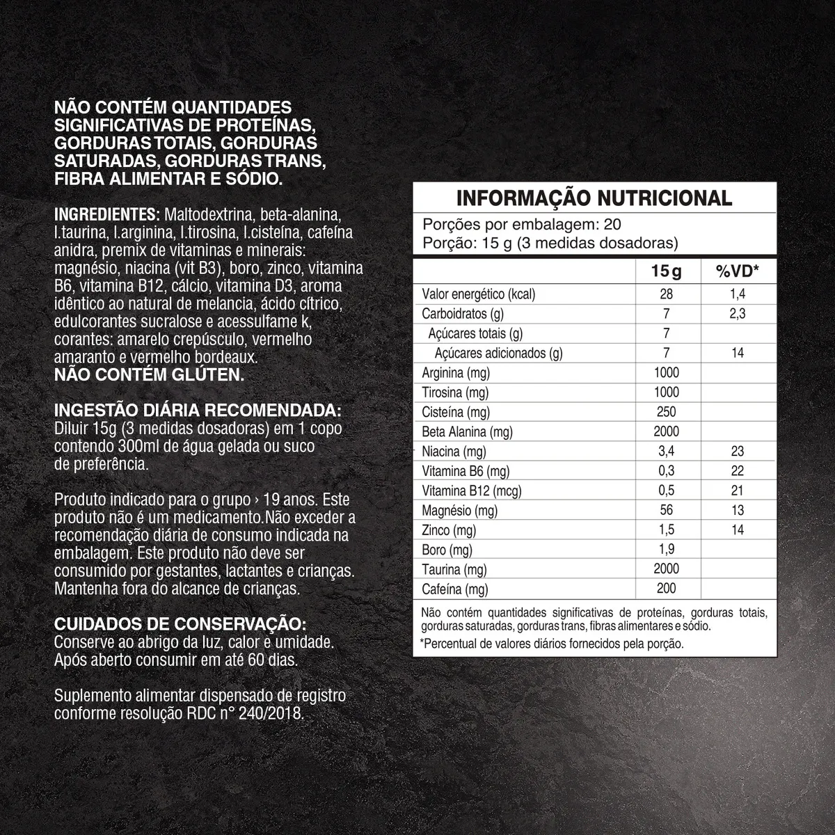 Aumenta a energia, o foco e o rendimento nos treinos. Fórmula termogênica que auxilia na performance, resistência e intensidade, com sabor refrescante de melancia. Ideal para quem busca treinos mais fortes e produtivos.